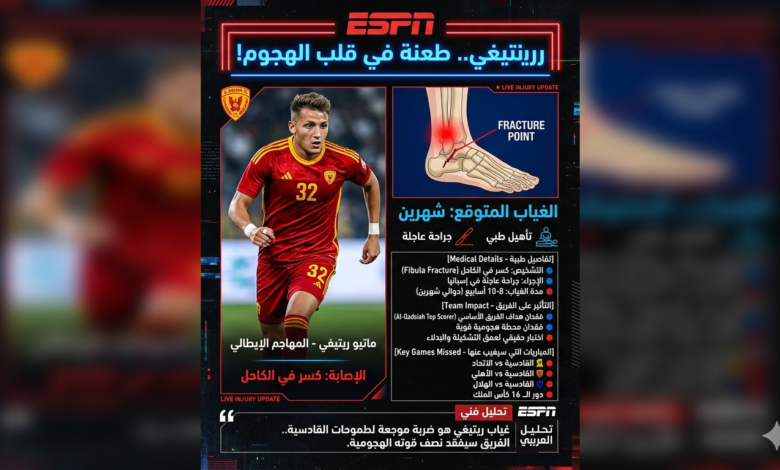 💡 خلاصة ESPN:إصابة ريتيغي هي “اختبار حقيقي” لشخصية القادسية هذا الموسم. الفريق الآن أمام خيارين: إما التكيف بسرعة مع غياب “الدبابة الإيطالية”، أو المعاناة في إنهاء الهجمات أمام الكبار.